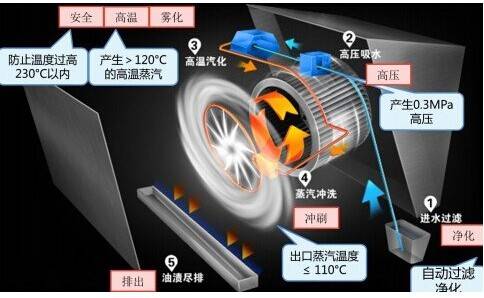 先飞带“蒸汽清洗”功能的烟机,是以高温高压的蒸汽流喷射冲洗涡轮叶片,蒸汽流温度高度110°,并以0.3MPa的高压喷射,这就是先飞“蒸汽清洗”烟机能够彻底洗净涡轮的核心技术,去污率可达98.5%。