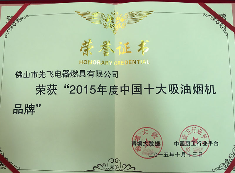 2015年9月20日,中国厨卫行业平台公布了“2015年度十大吸油烟机品牌”榜单,先飞公司荣获“2015年度十大吸油烟机品牌”。