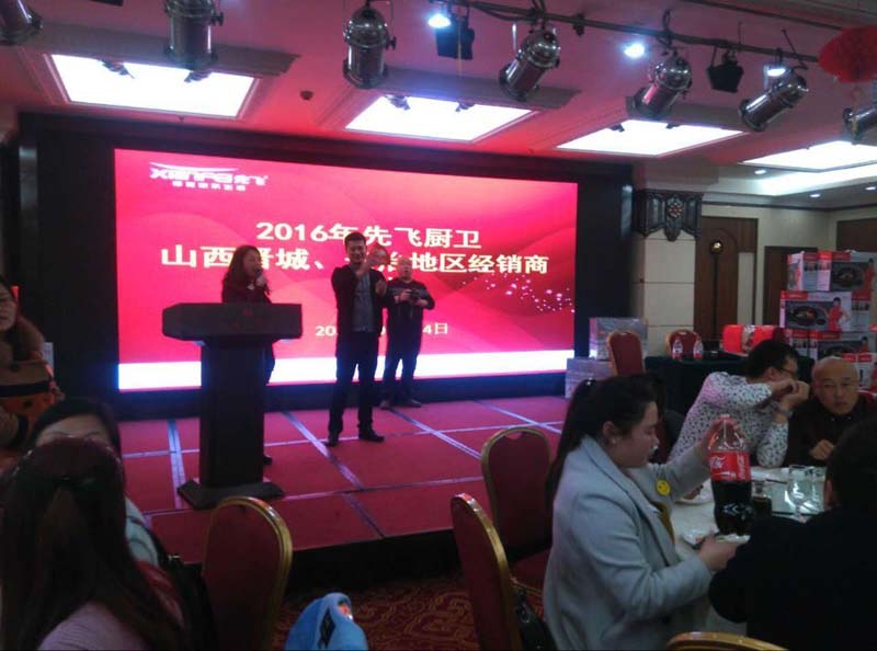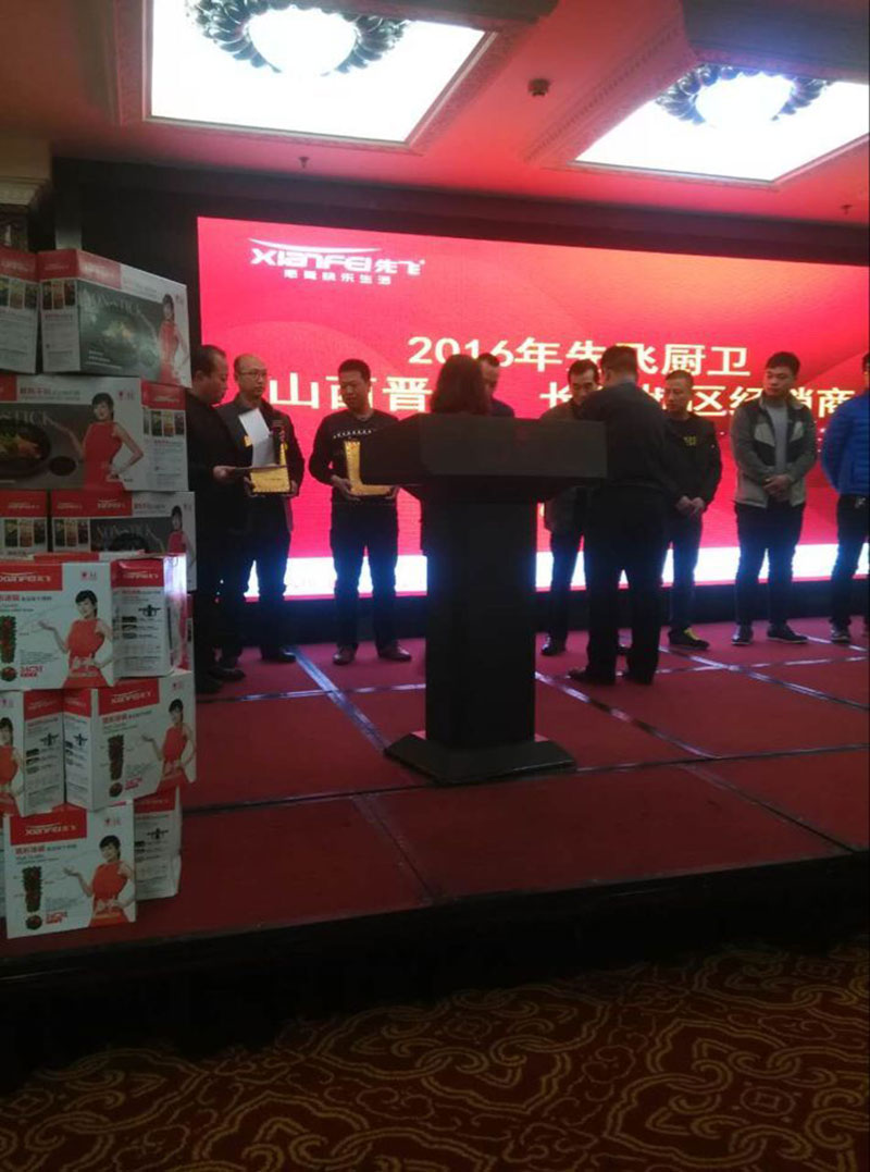 会议现场,先飞晋城办事处首先对于优秀经销商进行了授牌及表彰,随后先飞山西区域赵总就区域市场启动的深耕与承诺进行了讲解,得到了参会客户的强烈认同,先飞净水项目陈磊主管对于先飞净水机的答疑解惑更是让大家信心百倍!再好的营销也必须有好的产品支撑,先飞家用净水器及烟灶“感恩套餐”得到了参会客户的一致好评!(照片04 05 06)