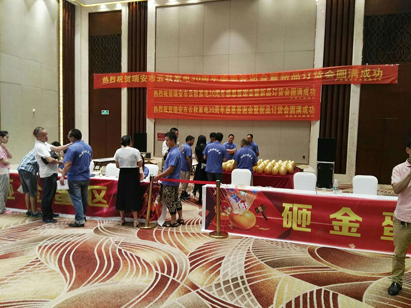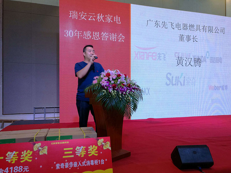 编者按:2016年8月8日下午,云秋家电30周年感恩答谢会暨2016年先飞秋季新品订货会在瑞安喜来君悦大酒店火爆召开!温州地区参会经销商朋友多达30桌,近300多人。在云秋家电30周年之际,先飞公司董事长黄汉腾先生在会上回顾往昔,展望未来,分享先飞公司近况与新品,赢得大家热烈掌声!会议期间收款超过300万,标志着会议圆满成功!