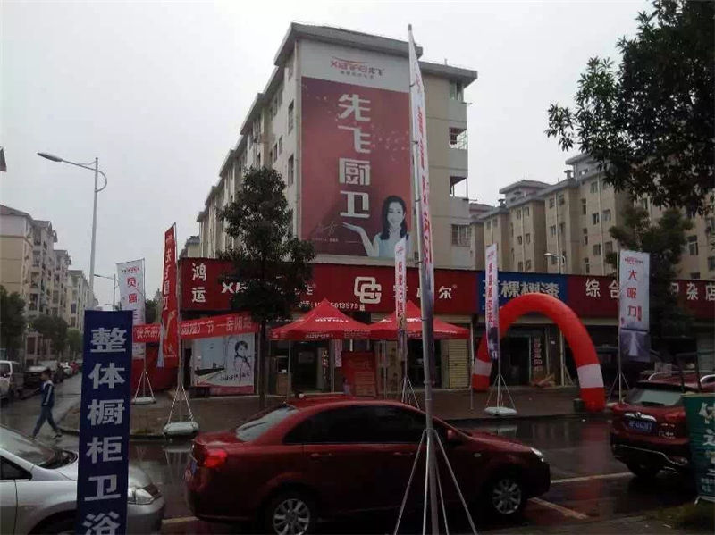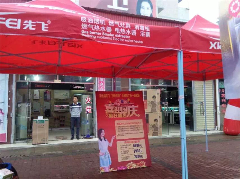 国庆期间,岳阳先飞走进小区,在凌泊湖先飞专卖店开展了大型促销活动!门店事先作了充足备货,而先飞拱门、大旗、帐篷、横幅、折页等宣传物料很好调动了现场热卖气氛。