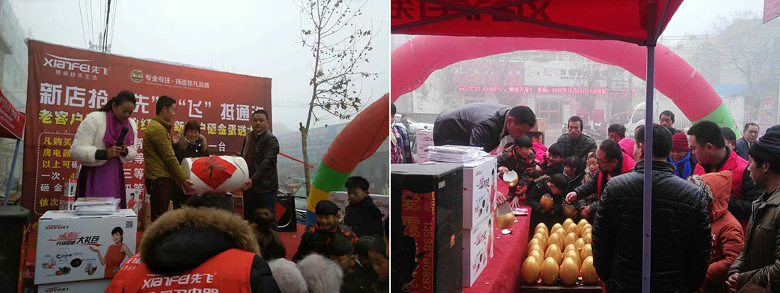 先飞大吸力功能性烟机,吸引了众多新客户的目光,开业的大力度促销活动更是吸引客户纷纷下单:砸金蛋、抽红包、老客户预约检修、微信点赞换取礼品。天道酬勤,前期七天的预热,现场大型路演活动,下单6.8折砸金蛋活动,彻底把开业活动气氛推向高潮!先飞团队的全员努力,终于换来了先飞品牌在通许市场的一日千里的蓬勃发展!